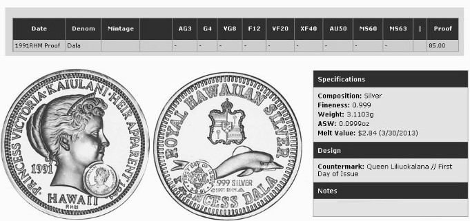 - Royal Hawaiian Mint records indicate that the obverse is dated 1990 with portrait of King Kalakaua and the text “Kalakaua I King of Hawaii”.