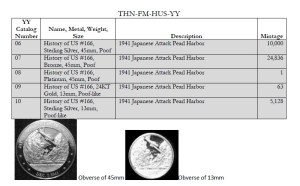 There are 5 medals ( THN-FM-HUS-06 thru THN-FM-HUS-10) for the 1941 Japanese Attack Pearl Harbor medals series (as compared to one mentioned in the M&R as 2M-211). The mintage looks high, but you have to consider that the mint figures are for sets. These sets must be broken up to obtain the desired specimen.