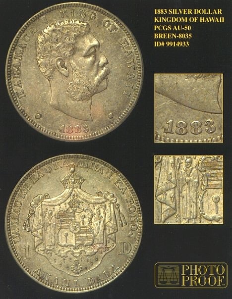 - 1997 King Kalakaua Hapalua Dala ½ oz – This is the first example I have seen of an un-serialized version of this coin. RHM documentation (COA) indicates there are 88 specimens with an engraved serial number on the reverse. This may be the only one without a serial number, thus making it an unique un-serialized version specimen.