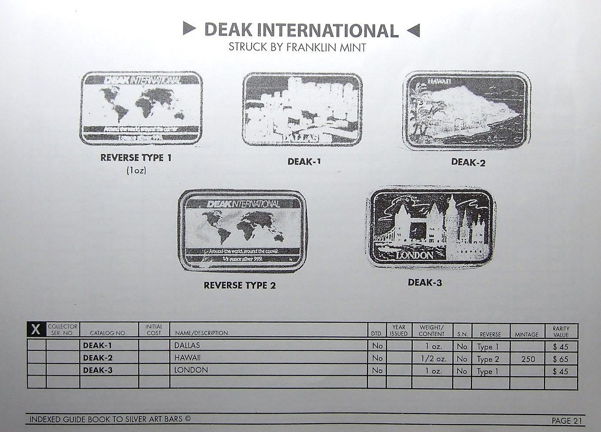 This book sells between $275 – $400. The old numismatic adage “Buy the book before buying the coin.” may not be cost effective here. 2SI-8 has a retail value of $70. However, it does have a limited mintage of 250. Snippets of page 21 from the Kidd book indicate that it’s identified as DEAK-2. Also, Franklin Mint is listed at the minter (Deak International is really the issuer).