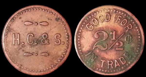 Below is an image of an undocumented copper token with the initials H.C. & S. These initials match Hawaiian Commercial & Sugar that was based on the island of Maui from 1882 to the present.