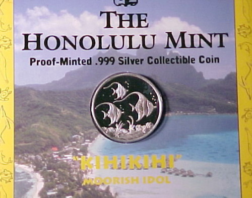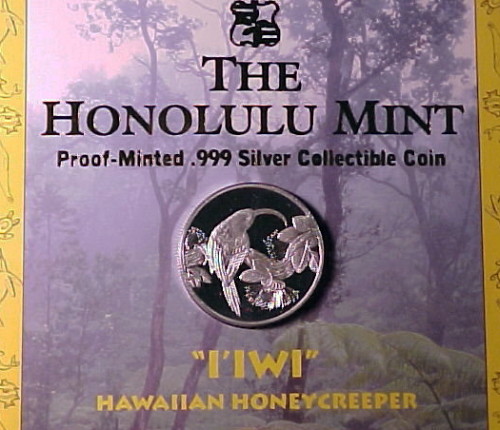 The Honolulu Mint offers a limited edition of the Hawaiian wildlife endangered species coin collection in a .999 pure silver one ounce coin; deluxe sets of .999 pure gold one ounce coin with two .999 pure silver one ounce coins. All coins are proof-minted quality with a certificate of authenticity.”