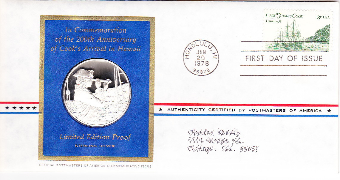Medal is 39mm Proof. Cover is postmarked Honolulu, Hawaii. The reverse of the cover serves as a COA.