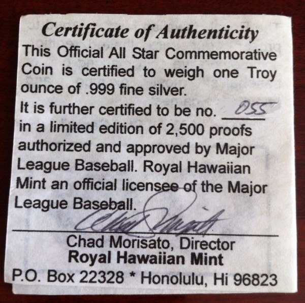 2003 Royal Hawaiian Mint Major League Baseball Coin June 8, 2014 / DrDarryl No RHM markings on the coin. The only way it was identified was with the COA. The coin is contract work for RHM by MLB. Share this: Click to share on X (Opens in new window) X Click to share on Facebook (Opens in new window) Facebook More Click to share on Pinterest (Opens in new window) Pinterest Like Loading... Related