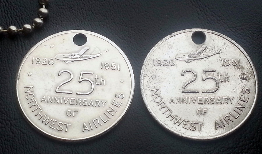 2M-340 Northwest Airlines 25th Anniversary 1926 – 1951 August 16, 2014August 16, 2014 / DrDarryl I acquired another 2M-340 specimen with proof-like fields (with original chain) for my collection. The images show the differences bwtween the two 63 year old specimens in my collection . Share this: Click to share on X (Opens in new window) X Click to share on Facebook (Opens in new window) Facebook More Click to share on Pinterest (Opens in new window) Pinterest Like Loading... Related