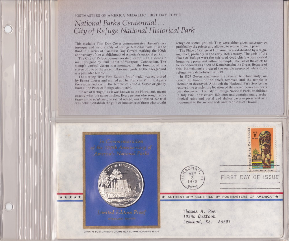 Intact medals in original postal cover is highly sought after due to its stamp and postal cancellation. This is a First Day Cover highly prized by philatelist (stamp/cover is cancelled with the date it was officially released by the US Postal Service). The medal and COA (reverse side of envelope) is highly desired by Hawaiiana numismatists. However, when a specimen with COA also comes with its description card and original Franklin Mint album page, this is the most desired collectible state. Below is such a specimen that is in my collection.