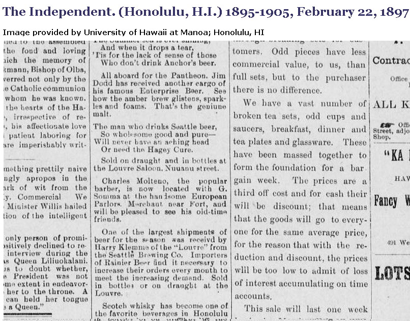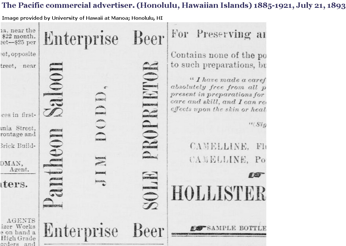 As you can see in the image below July 21, 1893 ad ties in three elements: James Dodd, Pantheon Saloon, and Enterprise Beer.