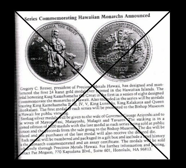 Below is a press release by Precious Medals Hawaii that I located. It should be noted that the mintage reference in this press release was planned. Mr. Reeser revealed that the dies to strike these medals were destroyed in a fire and resulted in a reduced mintage.