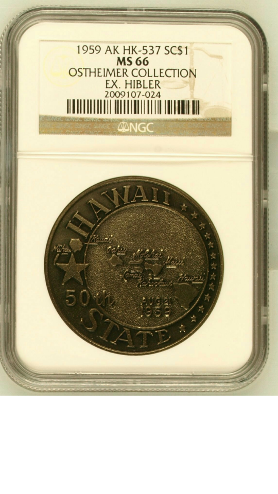 This uniface trial specimen is the rarest of the Medcalf & Russell cataloged Mishler issued Hawaii Statehood medals series (2MS-12 through 2MS-20). This piece is also identified as HK-537 so called dollar as cataloged by Hibler & Kappen. This is the NGC population specimen and has a lofty MS-66 grade to boot. Its pedigree: Ex. Ostheimer Collection, Ex. Hibler Collection. One of the great rarities added to my collection.