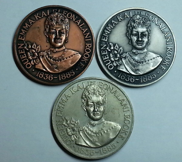 The aluminum specimen was acquired first and described in a previous blog entry. https://thehawaiiananumismatist.com/2014/02/15/2mn-673a-queen-emma-hawaii-state-numismatic-association/