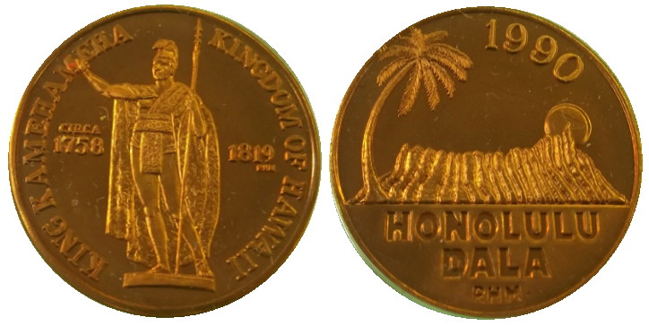 The first sleeper was a 1990 Honolulu Dala pattern in bronze with gold plating. Mintage is a scant 45 specimens. The hammer price was a mere 92 cents. Yes, 8 cents shy of $1. Listed in the RHM database and unlisted in M&R.