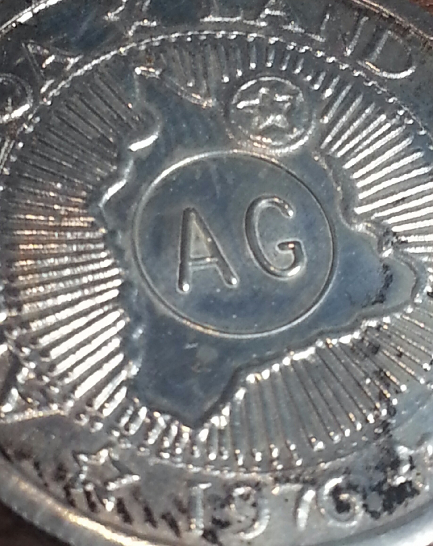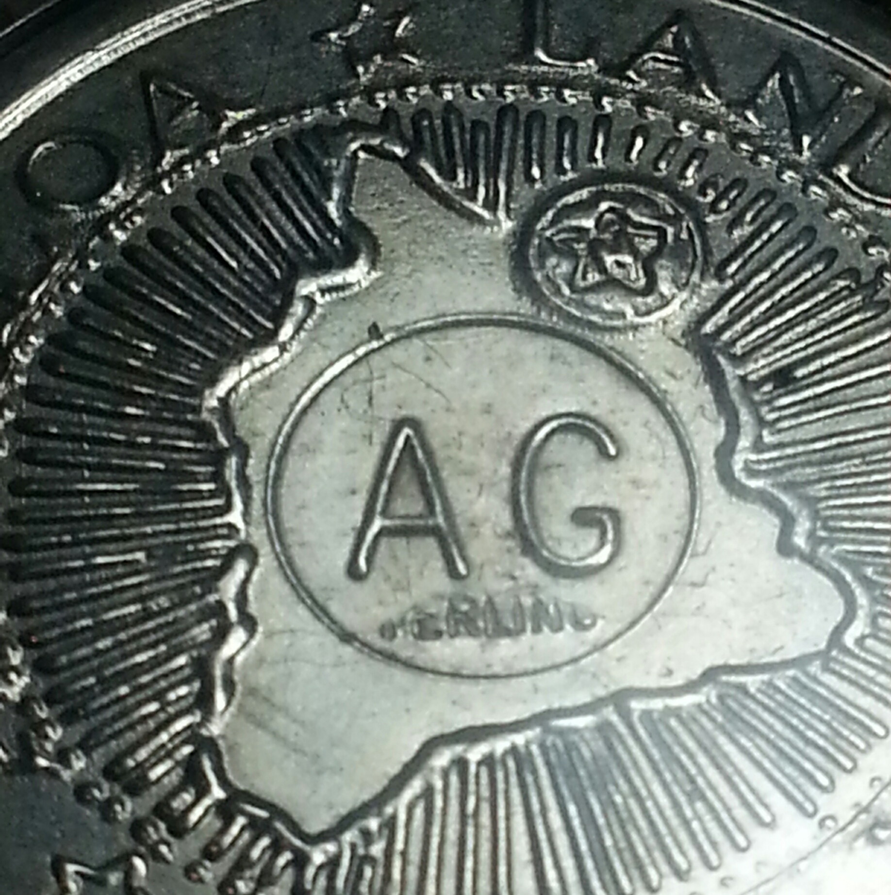 Below is a sterling silver Kamehameha I “with welt”, with “AG” and “with sterling hand punch”. Notice the incomplete letters in “STERLING”.