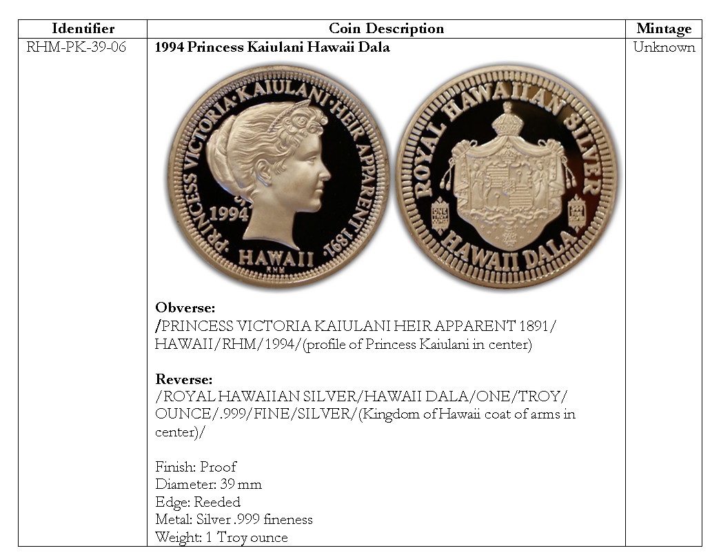 One of the difficulties in collecting Royal Hawaiian Mint® (RHM) issues is the lack of a comprehensive reference book for collectors. Information is scattered and incomplete among several resources. As an avid collector of the RHM Princess Kaiulani series, this lack of a collector reference book is a hinderance.